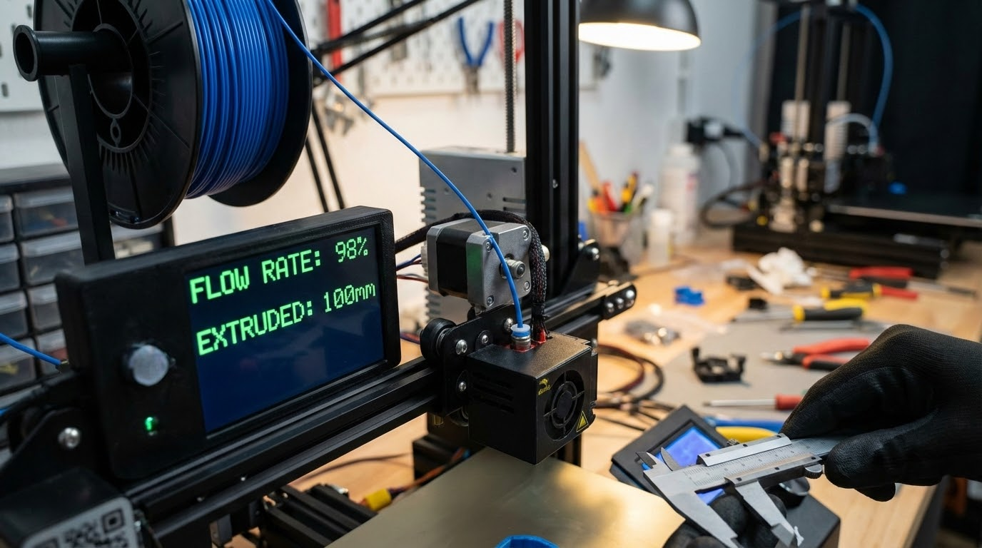 Before touching flow rate, make sure your extruder steps-per-millimeter (E-steps) are correct. These two calibrations are related but different. E-steps ensure your extruder motor physically pushes the right length of filament. Flow rate fine-tunes the volume of plastic deposited.